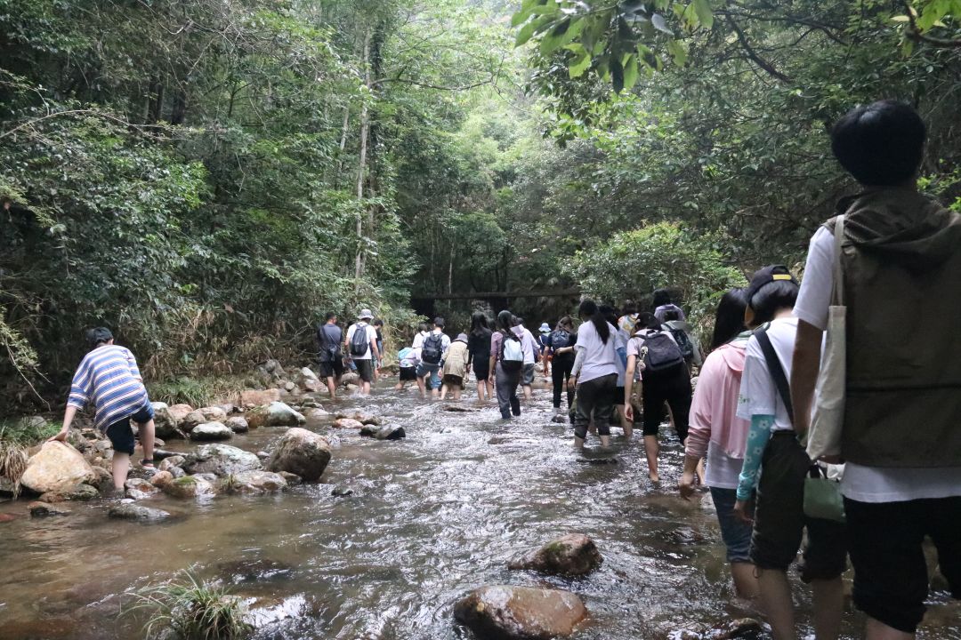 15:30左右,天气晴好,大家换好装备准备开展溯溪活动。一路上,大家明确了每个人秘密花园的范围,秘密花园小路尽头是一片瀑布,犹如一片白练自山崖飞溅而下。随后我们原路返回,在木栈道低矮处下河,期待已久的溯溪活动开始了。