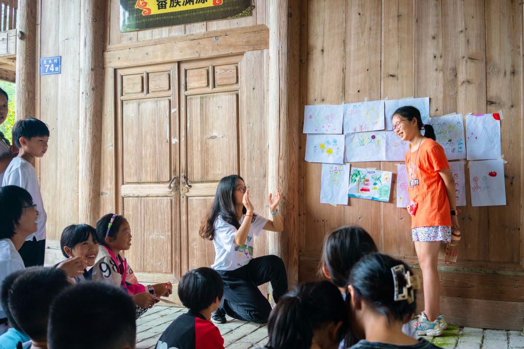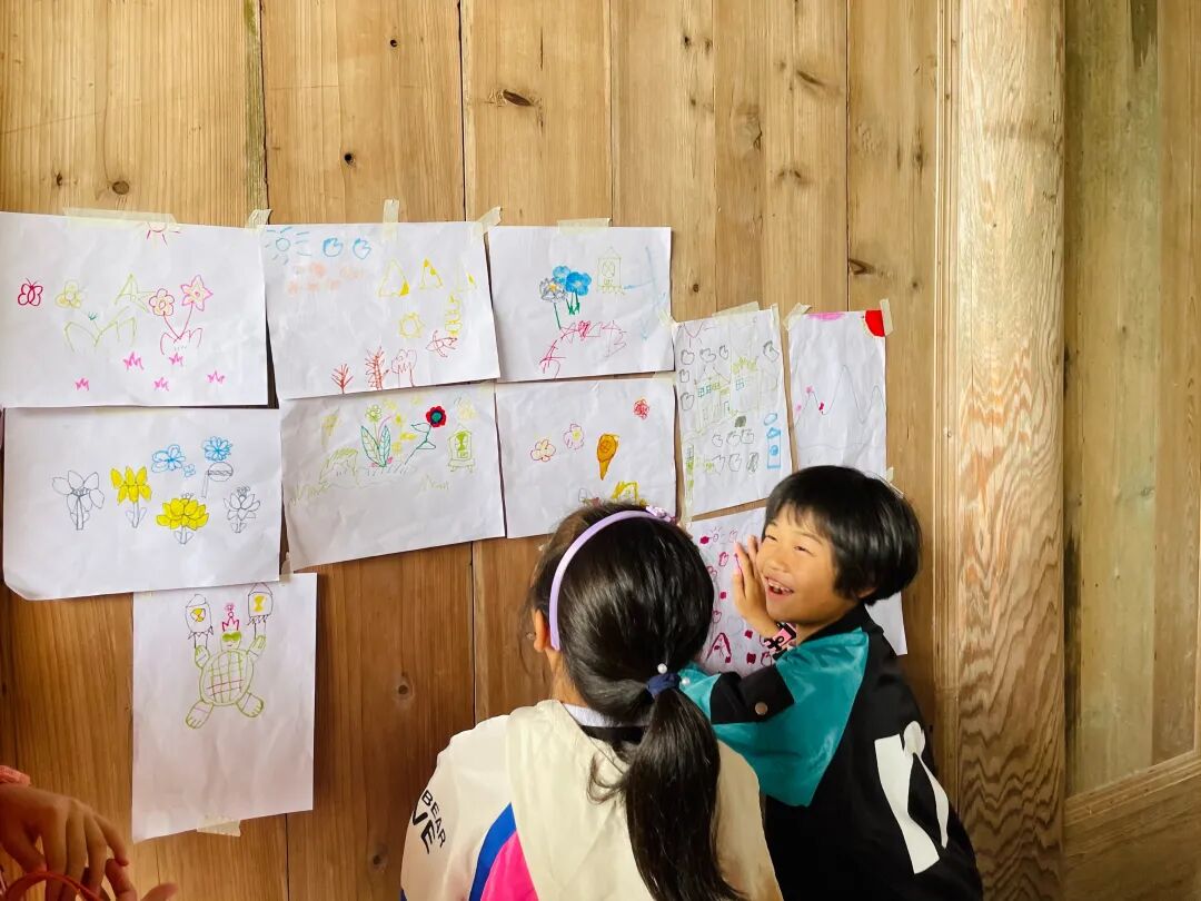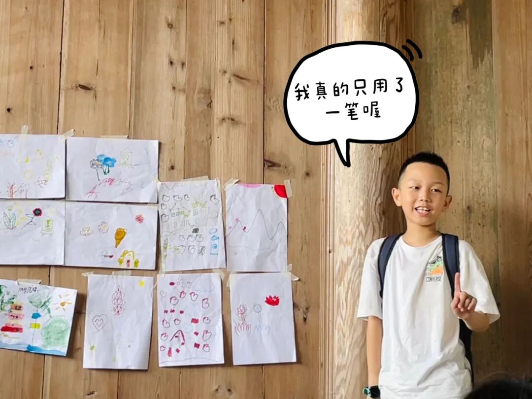 游戏后,开始联合绘画环节,约定每个孩子只能画五笔,大家共同完成一幅画。最后的“自然画展”的分享环节,在主持人狗尾草的温柔引导下,小朋友都积极主动分享自己的画作,其他营员也热情与小朋友互动,在每一位小朋友分享结束后用掌声鼓励,极大缓解孩子的紧张和羞涩感,在这个充满欢乐的氛围之下,每一位孩子都学会表达分享和耐心倾听,提升了他们的自信心,加深了他们在本次活动中的体验感,获得了更多的成就感。