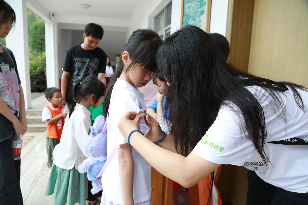 小朋友们陆续签到,并佩戴上绿色营的徽章