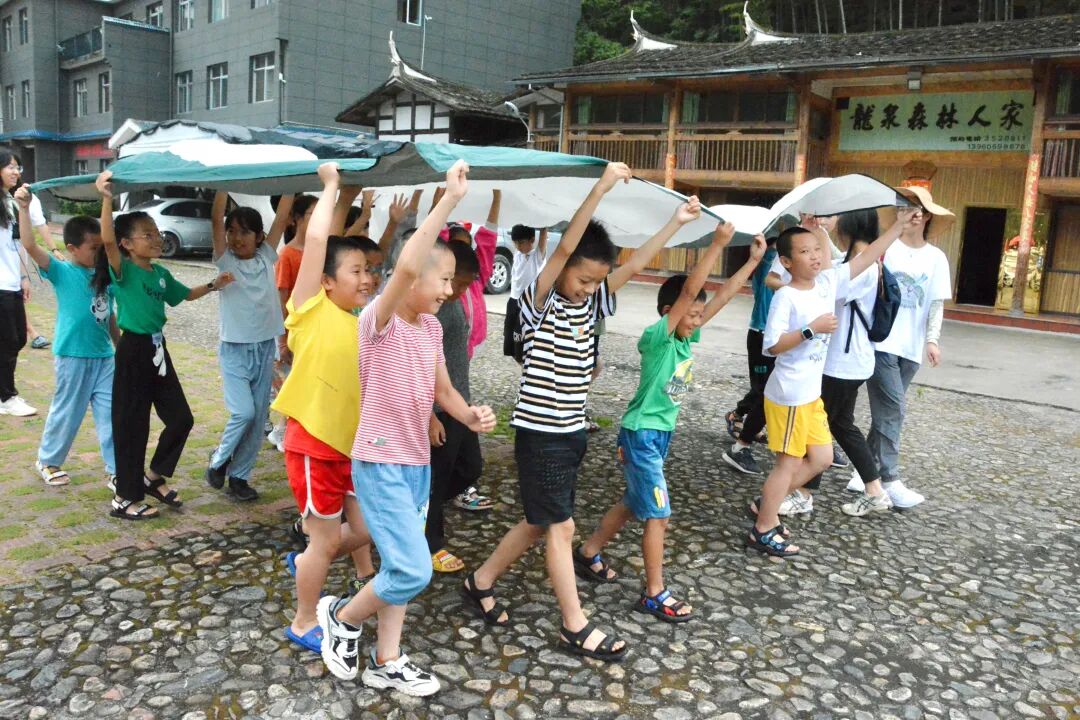 C组采用“自然寻宝”和“自然游戏”的结合方法,带领自然寻宝、盲听、兔子跳等活动,串起整个导赏过程,即便是突然变大的雨也无法阻挡营员和小朋友们探寻大自然的热情。大家在雨中即兴玩起了“移动城堡”的游戏,营员和小朋友们一起拉起露营用的天幕,在合作中快乐前进。
