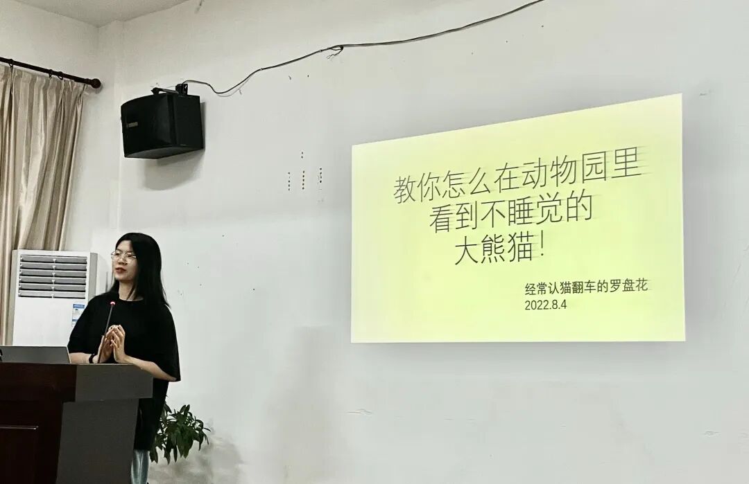 复盘结束之后是营员罗盘花的主题分享——《教你如何在动物园里看到不睡觉的熊猫》,她分别从“where在哪看”、“how怎么看”、“what看什么”和“why为什么要看”四个方面和大家分享了她的“传家之宝”。从罗盘花的分享中我们既被她对熊猫的热爱所感染,也收获了很多如何观察熊猫的实用小技巧。
