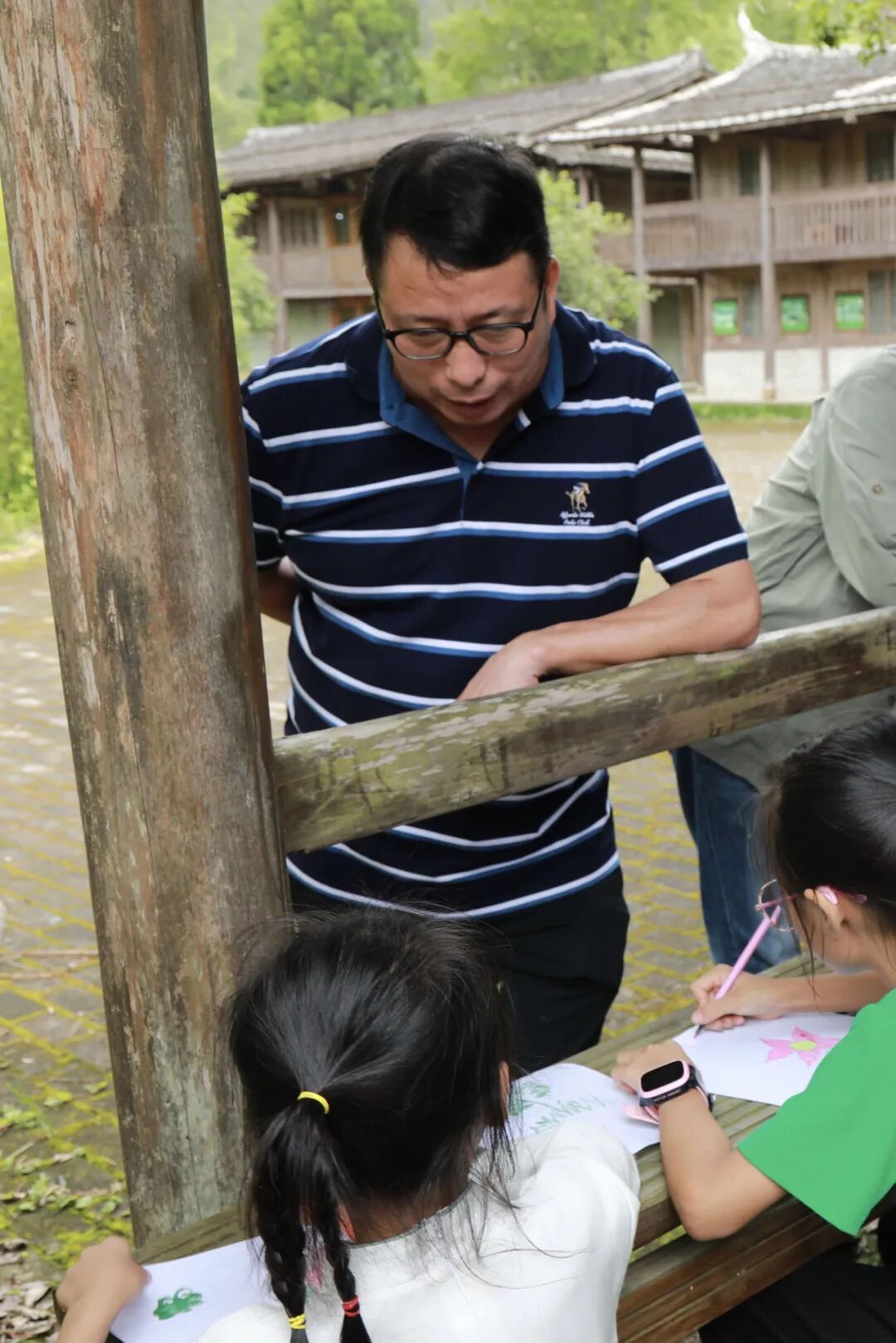 “科学家”花七教小孩子们使用望远镜去观察自然,黄副局长在旁观看