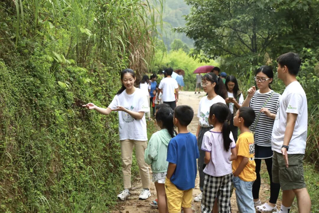 在室内小课堂结束后,小朋友们以不同年龄的进行排队分组,根据三个年龄段(9岁以下、9-12岁、12岁以上)划分三个小组,平衡小组内的孩子的认知水平和学习能力。分组结束后,营员们带领分好组的小朋友们开始近距离感受天宝岩的自然魅力和丰富的生物多样性。
