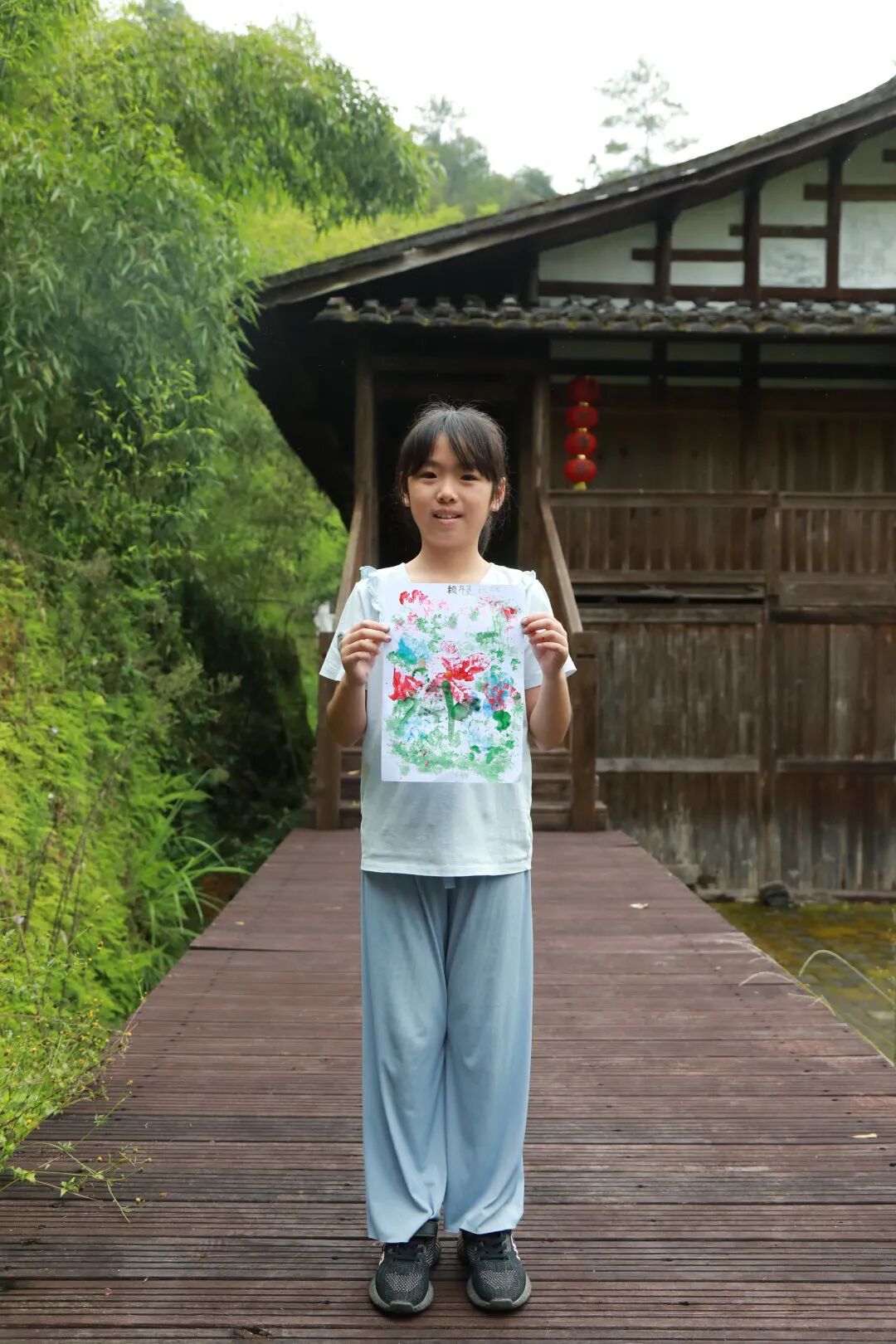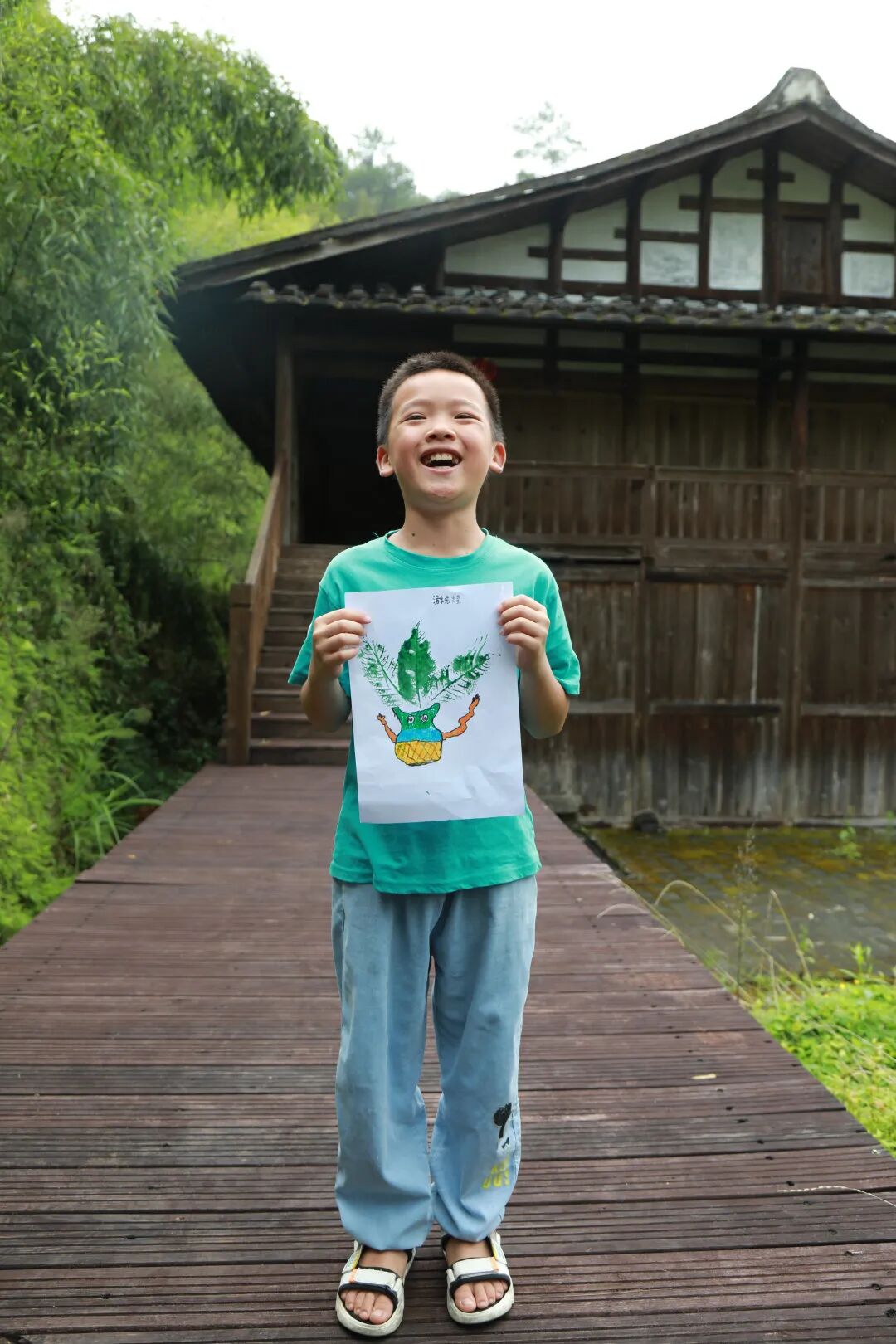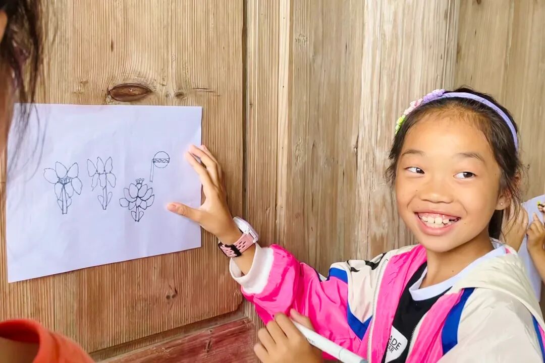 小朋友们开心地展示自己的自然画作