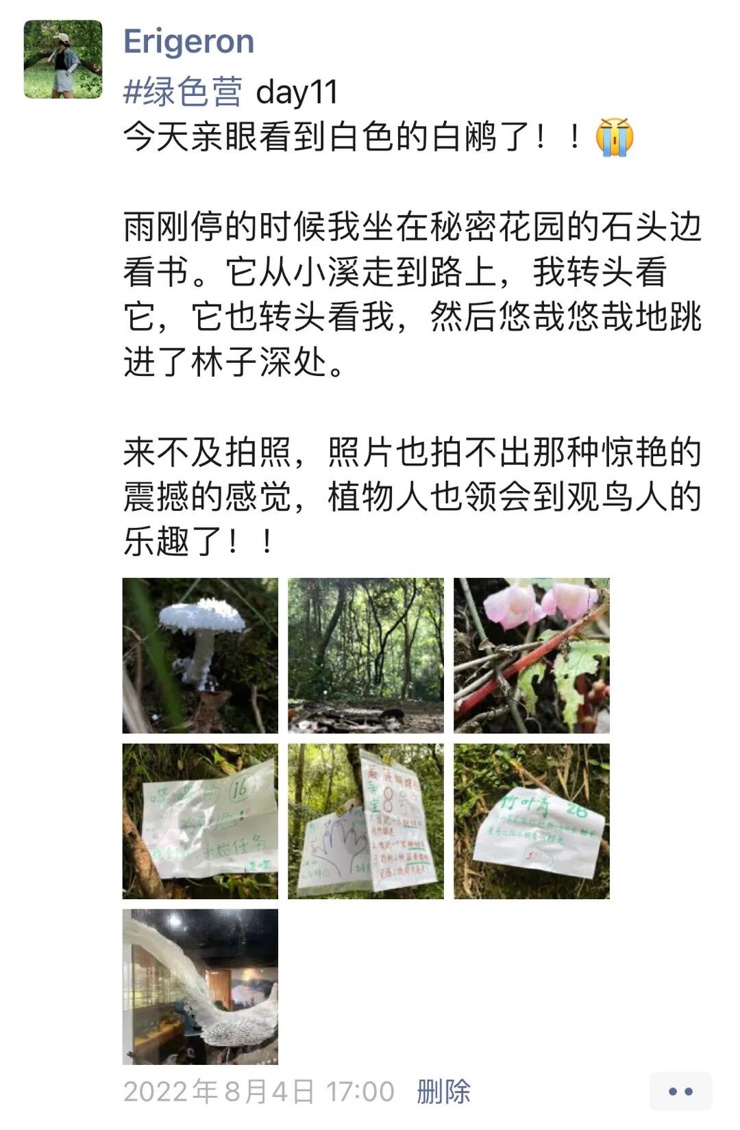 同时间,营员们在自己的秘密花园里完成自然观察和自然创作,既为秘密花园导赏视频做各种素材准备,也在为下午这场“森林之心自然探险活动”做预演。本次探险活动将串联起营员们所在的29个秘密花园里由营员自己设计的各种形式的自然导赏活动,这些活动分为三个类型:自然游戏、自然寻宝、自然讲解。