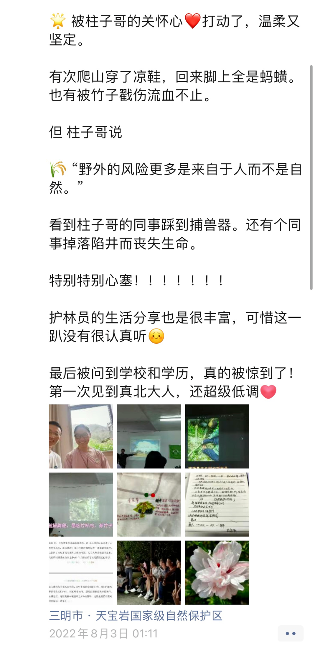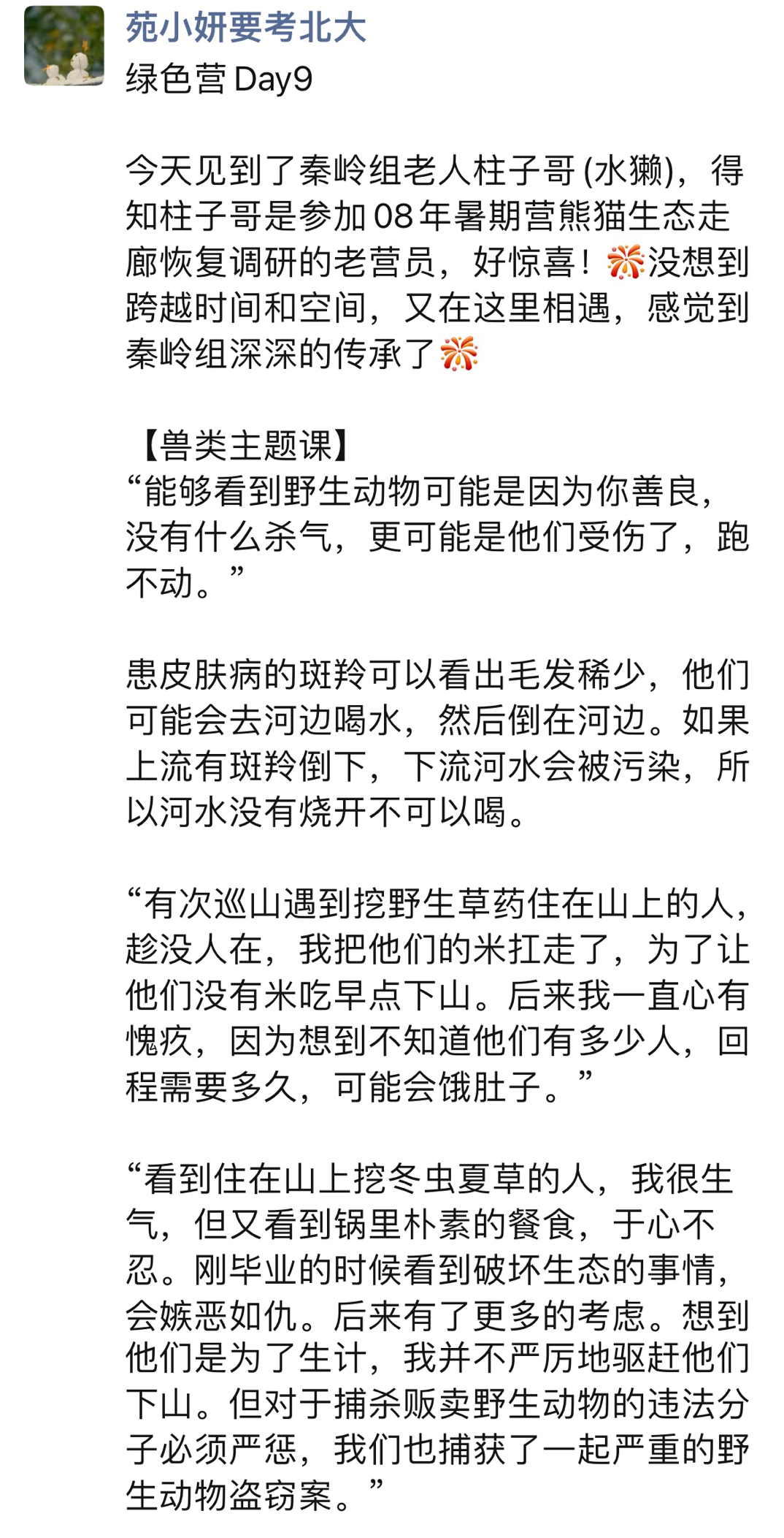他珍视这个身份,所以特意穿上保护区工作服来给我们讲这节课,和我们分享他这些年追寻大熊猫的踪迹、做相关调研、通过粪便来判断动物踪迹等经历。此外,柱子哥还分享了他做护林员时一些惊险有趣的故事,通过一张张图片,一帧帧视频,将每一个故事娓娓道来。