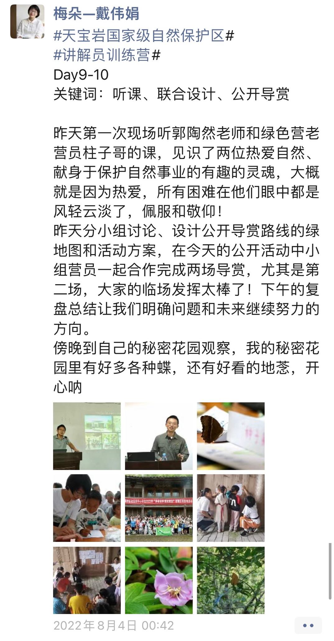 今天是营期的第10天,经过前期的室内外课程和实践培训,32名营员分为三个路线小组,各自进行讲解路线设计和筹备。路线涵盖天宝岩南溪溪流、管理所园区、龙头村边缘等地,环境各有特色。作为一名自然讲解员,我们将一起组织与保护区合作的2022年“亲近自然,爱我家园”暑期自然教育活动。由保护区与保护区周边社区进行对接和沟通,招募45名中小学生前来青水管理所参加由全体营员筹备的自然导赏活动。