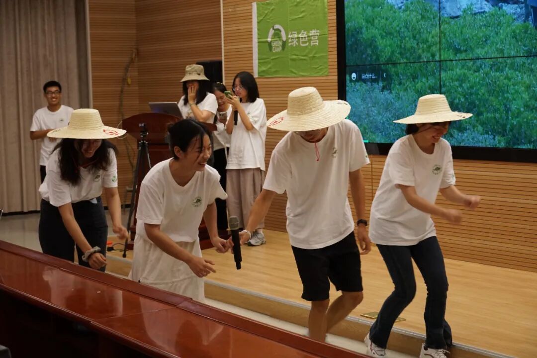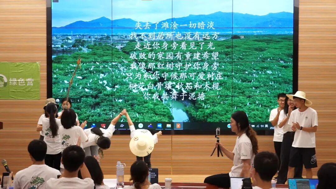 自然戏剧小组不仅编排了一出村庄情景剧,还填词创作了一首“红树林之歌”,伴随着背景图片动画的播放,组员们齐声合唱并邀请台下的营员。本戏剧着力塑造了“桐花”这一女性,意在表达女性角色在自然保护中的力量。
