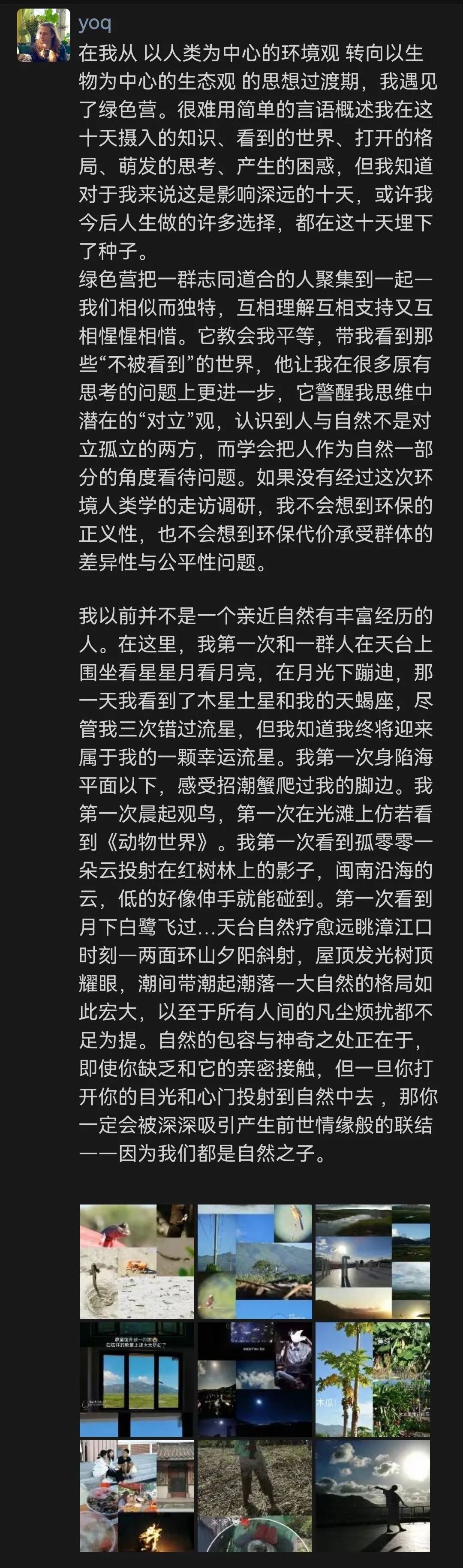 水杉说:“作为一个面向青年的社会组织,绿色营的理想与精神又在每一位营员中得到了传承与发展,大家接下来将带着营期中来自前辈老师的知识与技能、面对不满与摩擦时的争论与思考、走入自然中收获的发现与感动、憧憬理想和回顾现实时的纠结与徘徊……继续探索一个年轻的生命中未来的无限可能性,而在充满不确定性的今天,希望参与过绿色营的每位营员都能够仰望星空、脚踏实地,成为坚韧的探索者和守护者……希望大家不要忘了绿色营,继续在这个大家庭里拥抱、成长!“