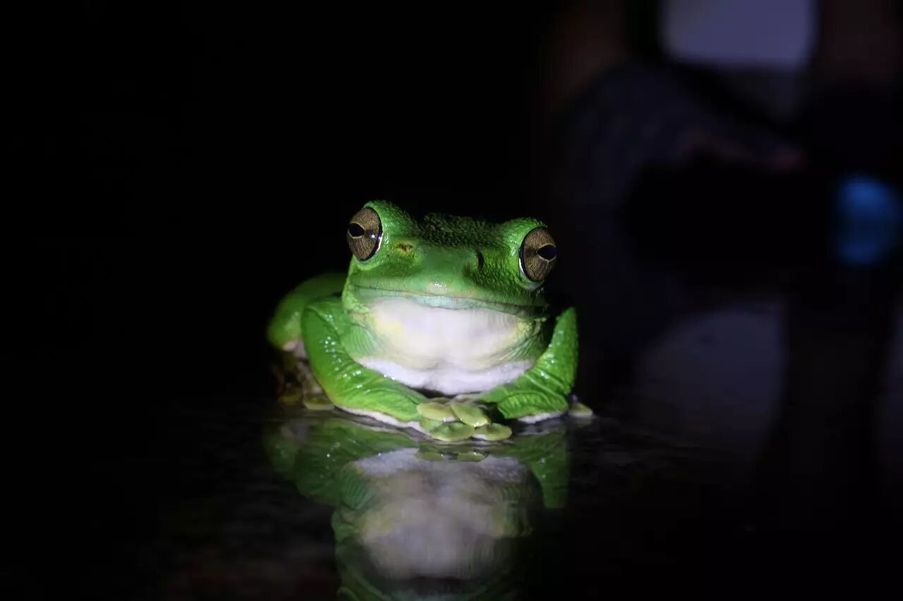 又是一个晴天霹雳的傍晚,我们收拾行装下田夜观。大家分成三队,向着荒野进发。不过几步,八爷就有了新发现——一只大树蛙!我们激动得一直拍照,老师们则保持着平缓的语调为我们讲解;有时还提醒我们不能长时间照射树蛙,干扰其自然生活。